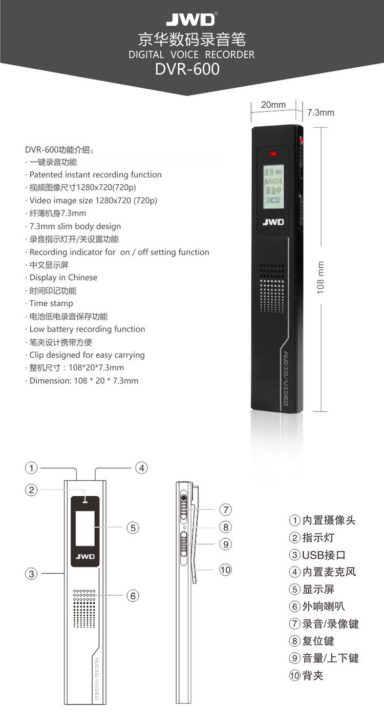 間錄音/錄像,可外接充電寶或者充電器工作)