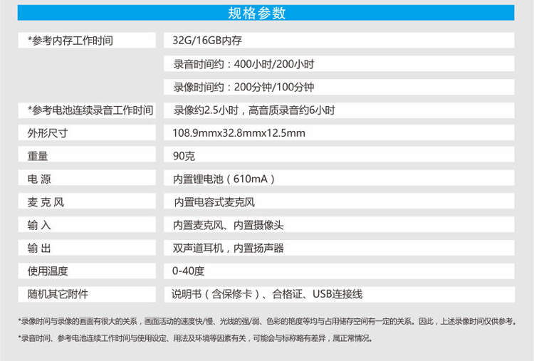 *參考電池連續(xù)錄音工作時間:錄像約2.5小時,高音質(zhì)錄音約6小時