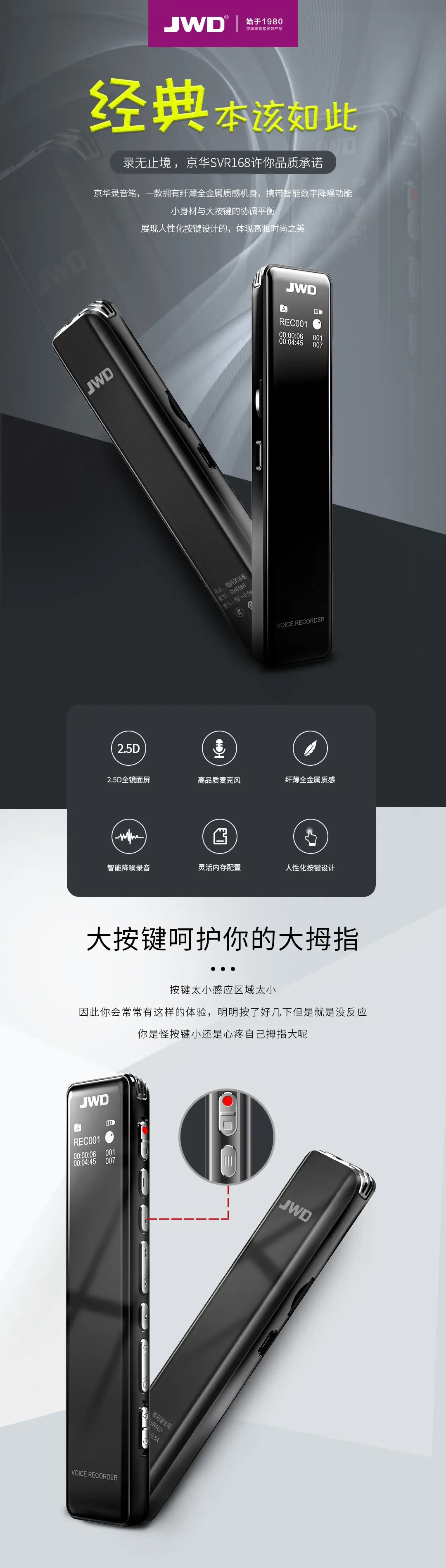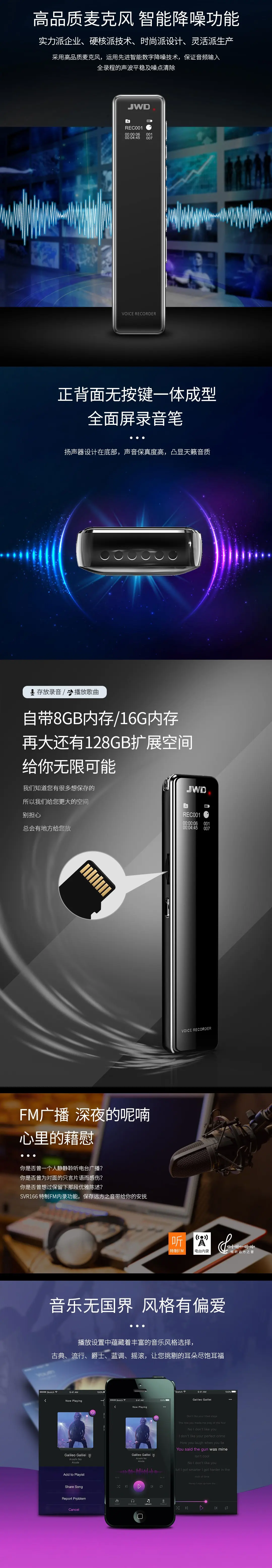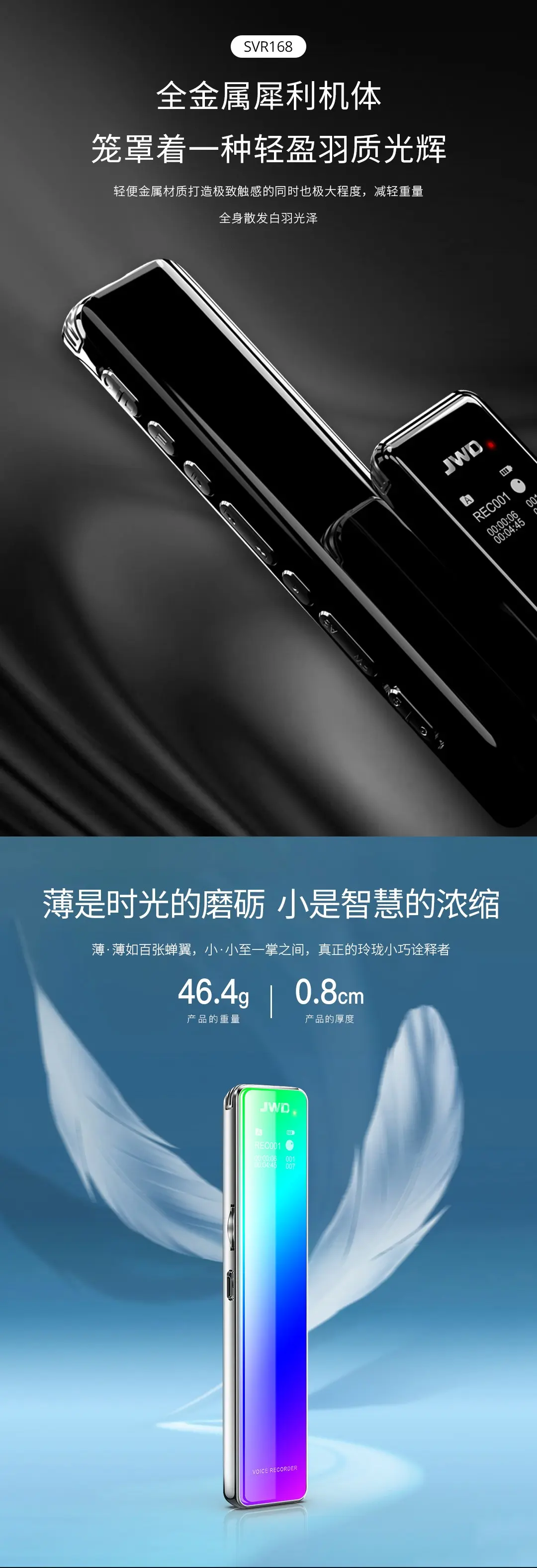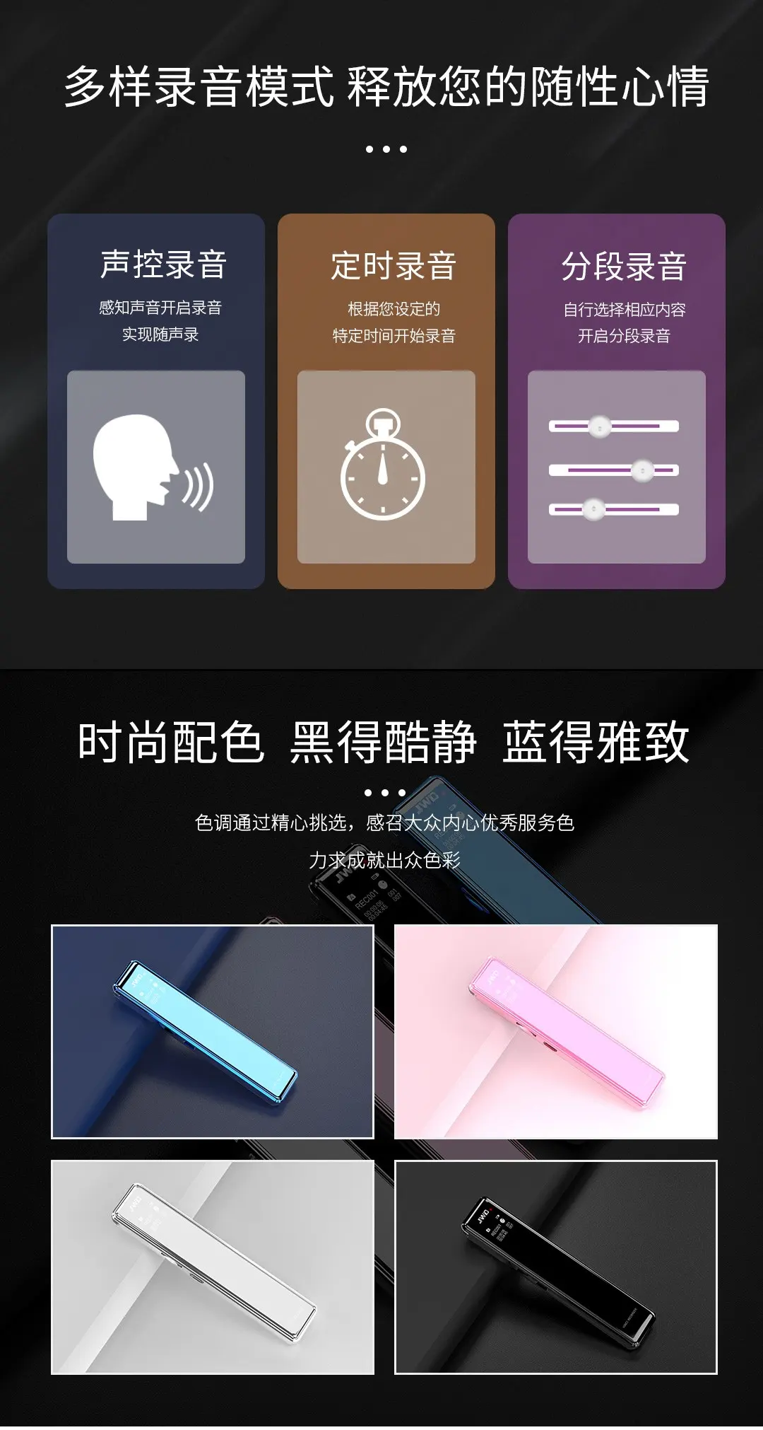 全金屬機體,智能數字化降噪輸入,聲控/定時/分段多樣錄音,四配色可選