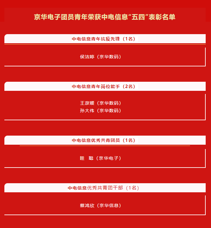 會上,公司黨委副書記、紀委書記羅云水宣讀了《關于京華電子“五四”評優表彰的決定》,希望受表彰的集體和個人,倍加珍惜榮譽,繼續發揚成績、再接再厲,奮進新征程、爭創新業績。希望公司各團支部和全體團員青年、團干部要以先進集體和個人為榜樣,緊緊圍繞公司中心工作,立足本職,發揮青年優勢,進一步解放思想、堅定信心、主動作為,為公司高質量發展貢獻青春力量。