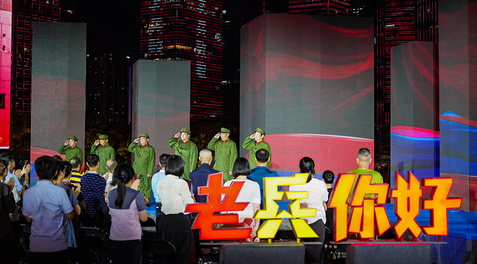 夜幕降臨,軍號響起,儀仗兵向老兵致敬。市民中心廣場周邊的樓宇建筑瞬間被耀眼奪目的燈光點亮,“老兵你好”“向老兵致敬”等宣傳標語映紅天際。千部無人機騰空而起,在夜空中靈動飛舞,先后編排出改革開放45周年、大鵬展翅、軍號、八一軍旗等造型畫面與市民中心廣場絢麗的舞臺交相輝映。參加節(jié)目錄制的老兵們身著戎裝,與市民群眾共賞這場光影盛宴。