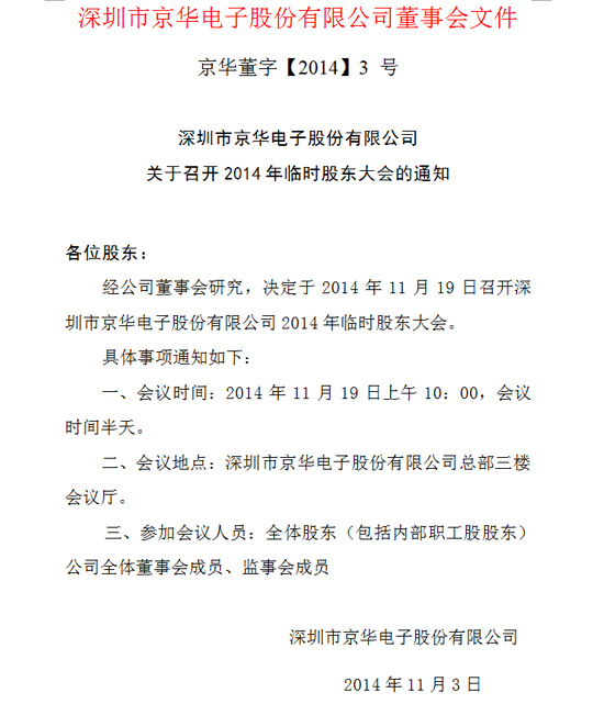 深圳市京華電子股份有限公司關(guān)于召開2014年臨時股東大會的通知